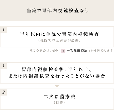 除菌判定で、上部消化管内視鏡を受けていただく必要はありません。便中抗原測定法あるいは尿素呼気試験(絶食でご来院いただく必要性があります)で行います。