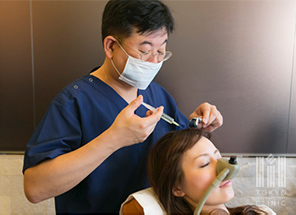 当院で行う薄毛治療は、「SAIMO(サイモ)」と呼ばれる東京国際クリニック独自の治療法です。発毛を促す250種類以上の薬液(成長因子)をベースに、患者さまおひとりおひとりの頭皮(毛根)・頭髪の状態を見極め、さらに薬液を調合します。その薬液は、髪の毛を生み出す細胞(毛母細胞)に直接注入し刺激することで発毛を促します。