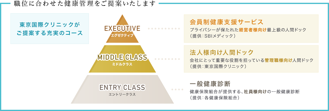 もし、会社の経営を担う経営者層が病気になり、長期の療養や経営から外れなくてはならなくなった場合、一瞬にして経営が立ち行かなくなったり、社会的評価が下がり、社員の動揺も大きくなることが想定されます。そのような事態にならないよう、リスク管理の一貫として、職位に応じた健康管理をご提案いたします。定期的な人間ドックを通して、医師との面談やドック後のフォローアップで病気の予防、早期発見・早期治療のお手伝いをさせていただきます。