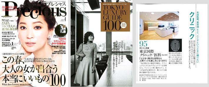 「Precious」TOKYO LUXURY GUIDE別冊4月号に当院にて今年3月より正式受診スタートしました総合人間ドック(スタンダードコース)と、まつげ&眉毛の植毛に関する取材記事が掲載されました。